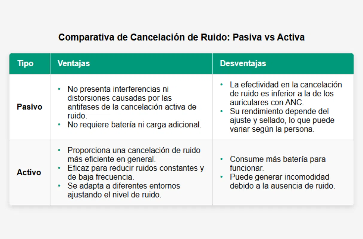 • La cancelación pasiva se basa en el diseño físico y materiales para bloquear frecuencias medias y altas, sin consumir batería.