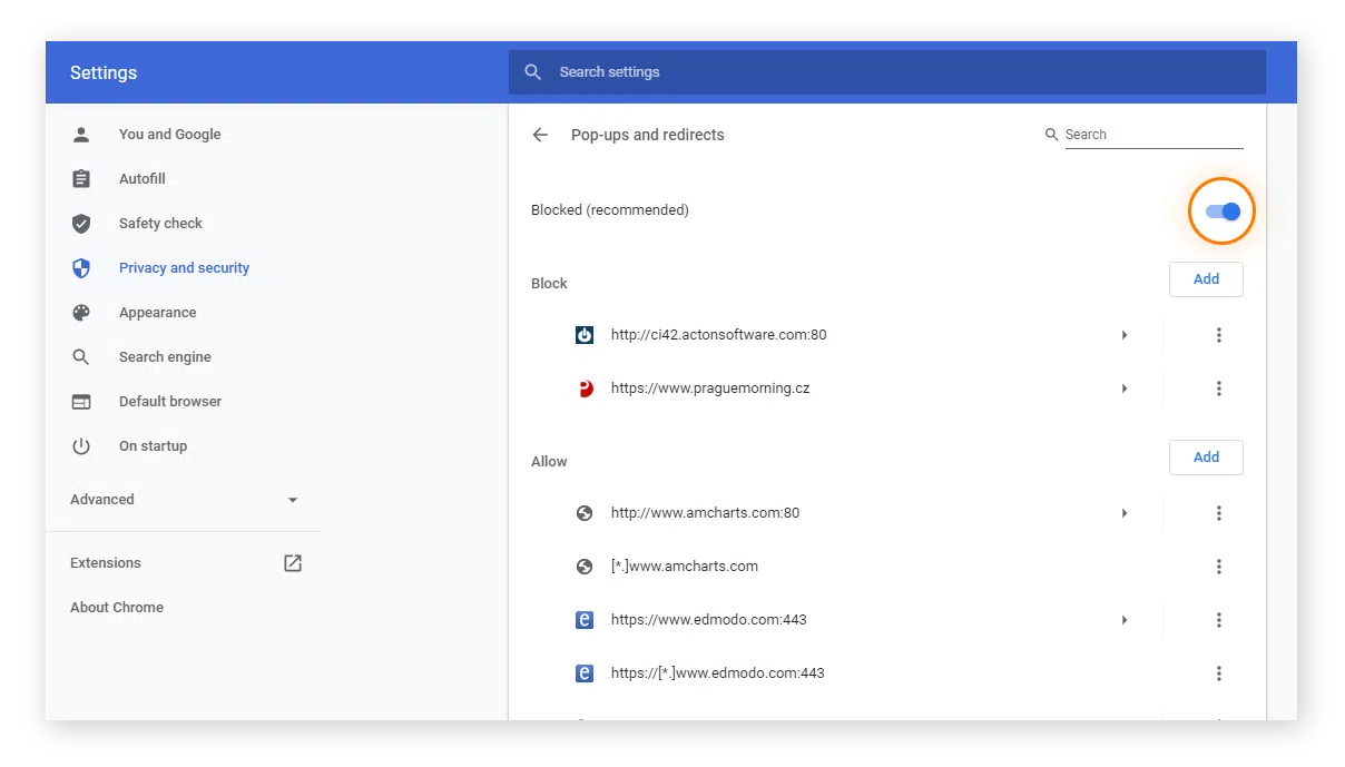 - Desplázate hasta Ventanas emergentes y redirecciones.