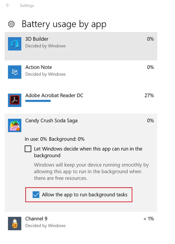 A continuación, seleccione Uso de la batería por aplicación en el panel izquierdo y localice la aplicación que desea excluir de Power Throttling, y desmarque la opción » Deje que Windows decida cuándo esta aplicación puede ejecutarse en segundo plano «. Una vez desactivada la opción, aparecerá una nueva casilla de verificación, » Permitir que la aplicación ejecute tareas en segundo plano «. Seleccione esta opción para permitir que la aplicación se ejecute en segundo plano.