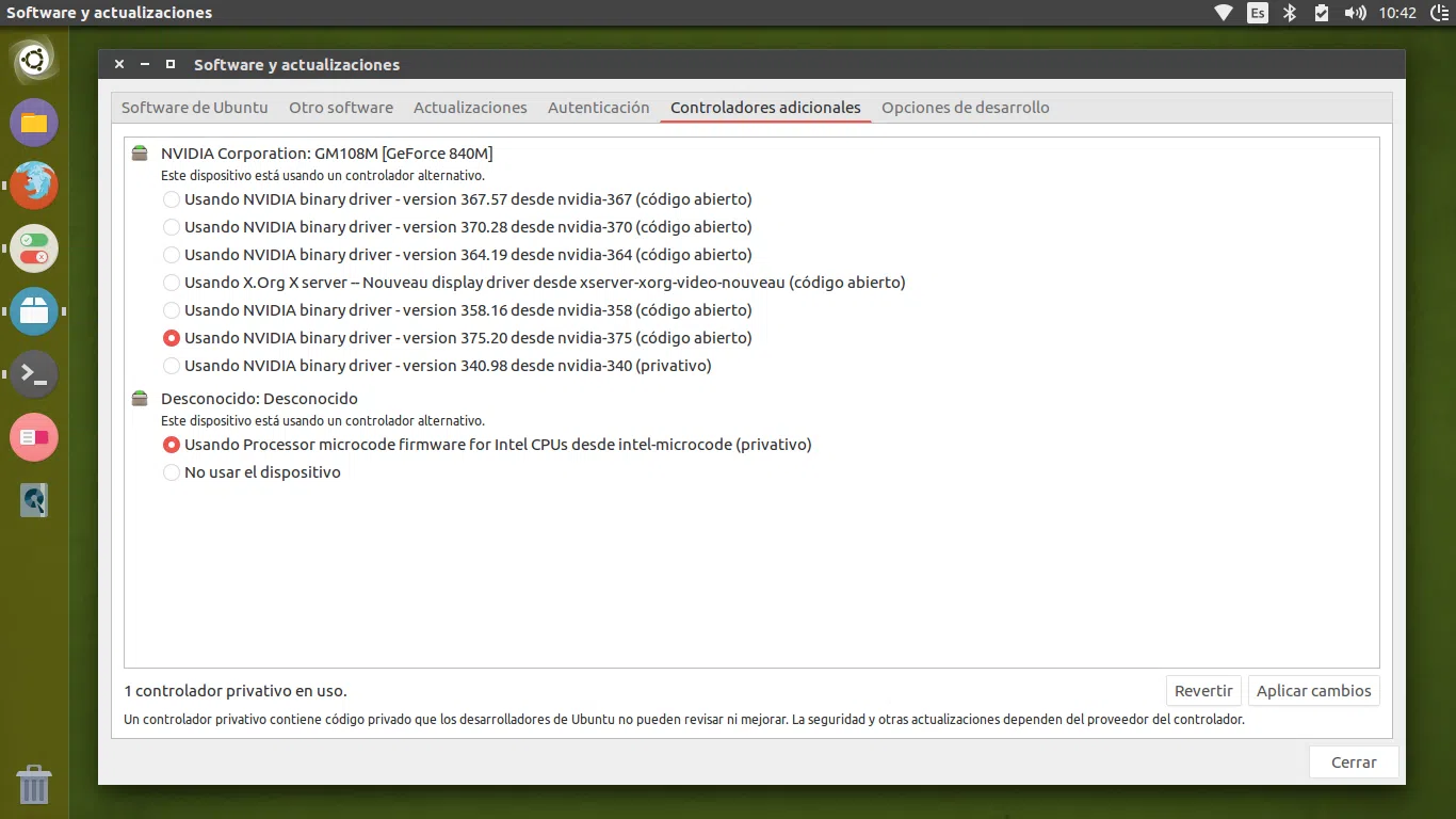 Con eso hecho, puedes ir a “Configuración del sistema > Software y actualizaciones > Controladores adicionales” y verás listadas versiones más modernas de los drivers NVIDIA para tu GPU. Por ejemplo, si tienes una Geforce 840M, puedes comprobar en la web de NVIDIA cuál es el último driver compatible (pongamos que es el 375.20) y seleccionarlo en esta ventana.