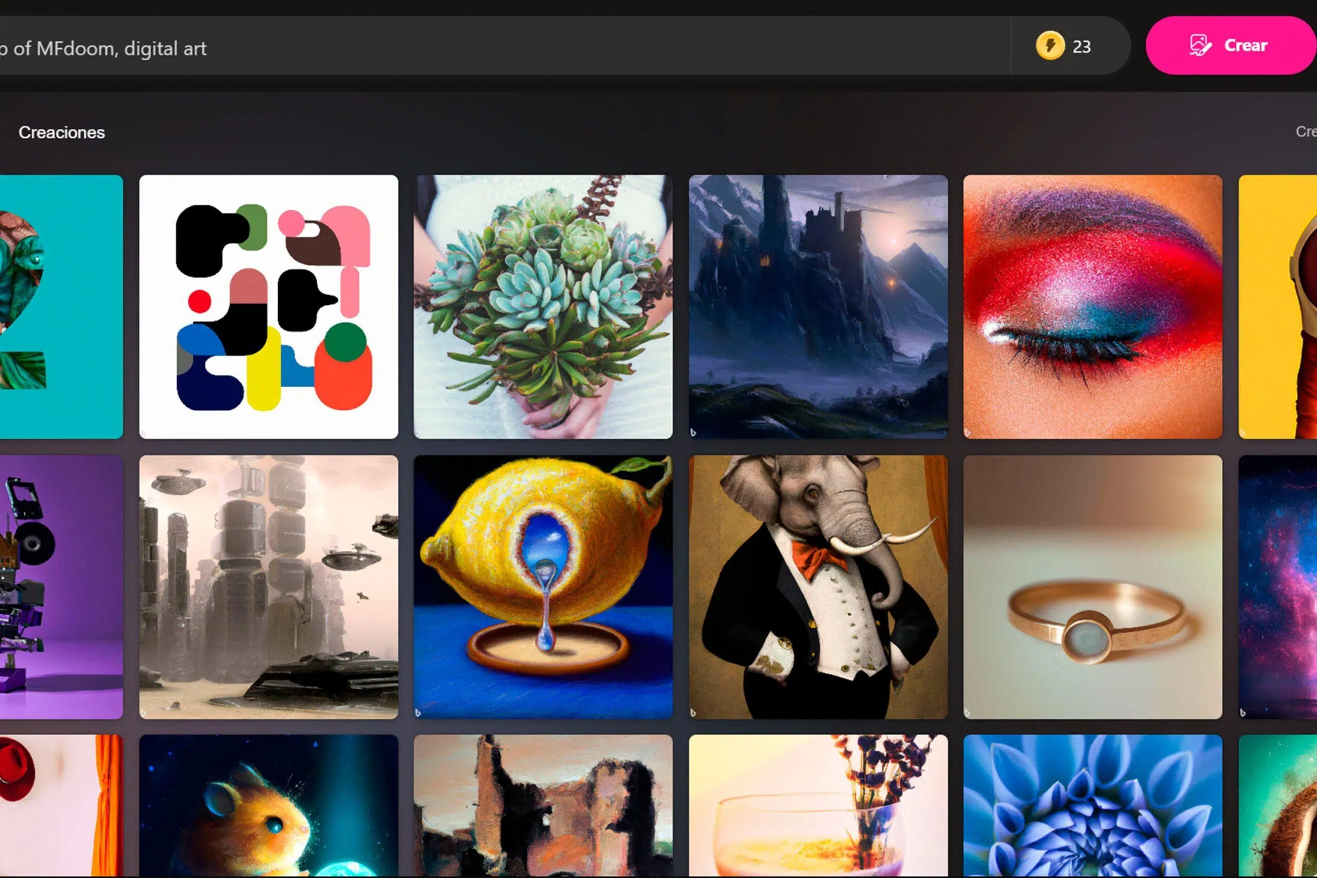En la página de inicio de bing.com/create, se muestran trabajos de otros usuarios a modo de galería. Sirve para inspirarte y entender cómo interpreta la IA ciertos prompts. Arriba tienes el cuadro donde introducir tu idea; cuanto más clara y rica en detalles, mejor.