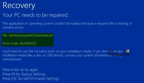 Los códigos de error 0xc000000225 , 0xc00000e y 0xc000000001 están asociados con el error del archivo Winload.efi no encontrado .
