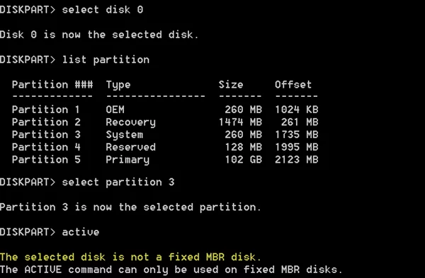 El error sólo ocurre cuando intenta activar una partición de disco en una partición de sistema UEFI. Sin embargo, el comando sólo funciona cuando se dispone de un sistema basado en BIOS/MBR. El método UEFI no tiene concepto de la partición activa. Dado que tiene un sistema UEFI, el tipo de disco es GPT en lugar de MBR. Para resumir, BIOS necesita el tipo de disco MBR, mientras que UEFI necesita el tipo de disco GPT.