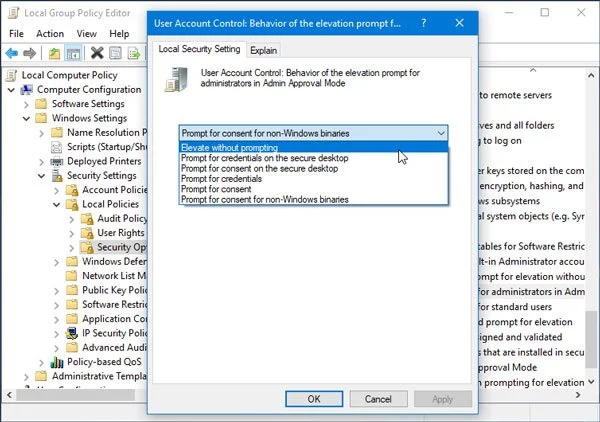 En el menú desplegable, seleccione Elevate without prompting y haga clic en el botón OK para guardar el cambio.