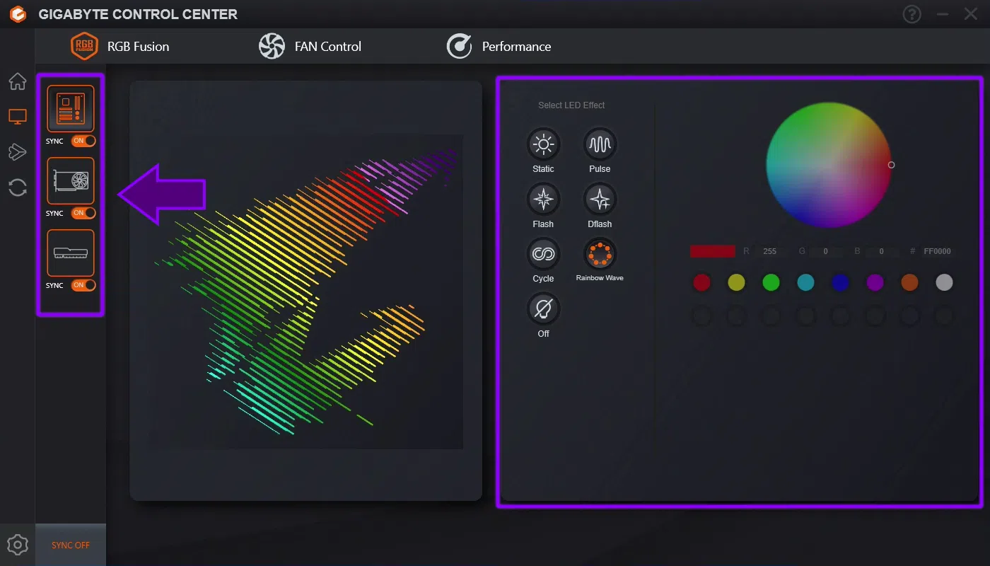Una vez que tengas todo bien conectado, abre RGB Fusion y selecciona un modo de iluminación global. El programa te permitirá aplicar un efecto común a todos los componentes soportados, de modo que la placa, la gráfica, la RAM y los periféricos AORUS cambien de color al unísono o sigan un mismo patrón.
