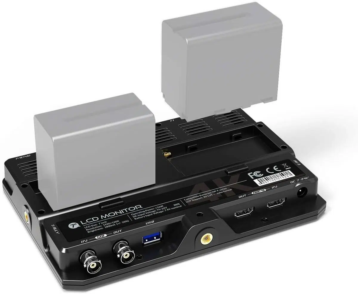 La alimentación está resuelta mediante una placa de batería integrada de la serie L y un puerto de entrada de 12 V CC para uso con fuentes continuas. Además, cuentan con salida de alimentación DC auxiliar que permite energizar determinadas cámaras a partir de la batería del monitor, algo muy útil cuando quieres reducir el número de baterías en el rig. Para evitar problemas térmicos, un ventilador trasero se activa automáticamente cuando el brillo del backlight supera un valor determinado (por ejemplo, 80 en la escala interna).