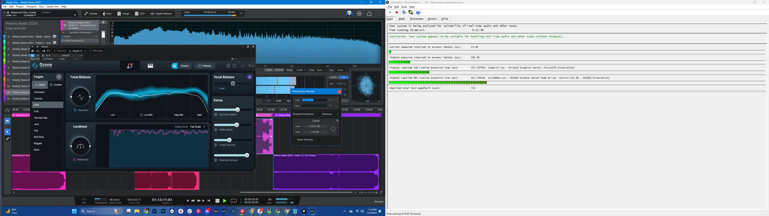 Lo recomendable es dejarlo correr al menos unos minutos mientras utilizas el PC de forma habitual: reproduce música, abre tu DAW, juega unos minutos o navega como sueles hacerlo cuando aparecen los problemas. En cuestión de segundos ya mostrará barras de latencia que suben y bajan, pero lo interesante es observar cómo se comporta a lo largo del tiempo y si en algún momento cambia el mensaje de estado de la parte superior.