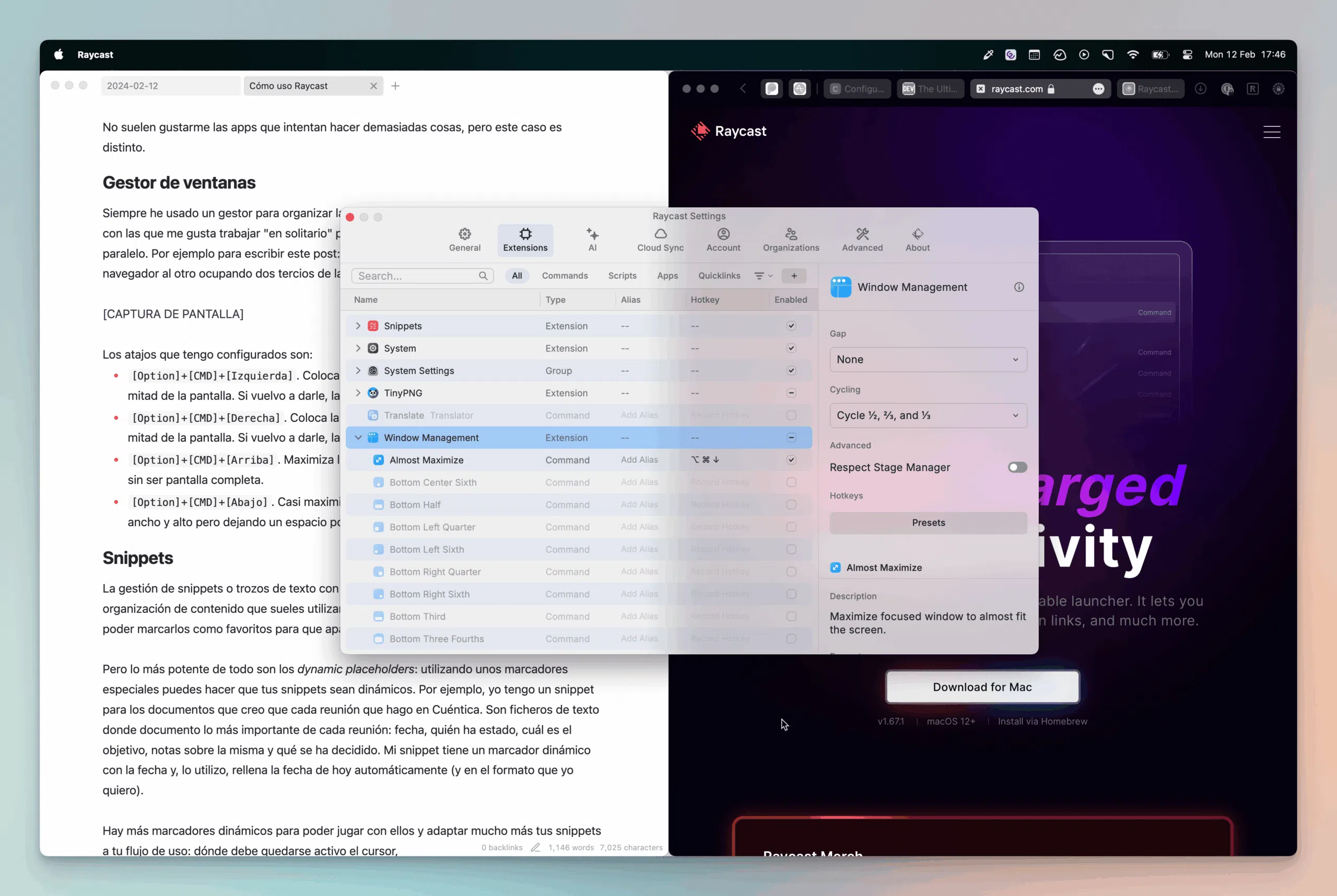 La experiencia con la gestión de ventanas puede ser algo polarizante. En Windows ya existen atajos nativos muy rápidos (Win + flechas) y, para redimensionar libremente, mucha gente sigue prefiriendo el ratón. En Raycast, algunas operaciones como reducir el tamaño requieren repetir varias veces un comando de “hacer más pequeña” que va ajustando la ventana poco a poco, lo que a algunos les resulta menos natural que simplemente arrastrar una esquina.