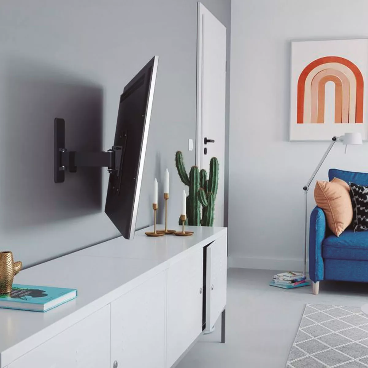 Si optas por colgarla, el abanico mural es amplio: hay soportes articulados, inclinables y planos, y hasta opciones específicas para paneles OLED que cuidan ese tipo de construcción más delgada. Elige articulado para orientar la tele, inclinable para mejorar la ergonomía cuando se instala alta y plano para un look integrado.