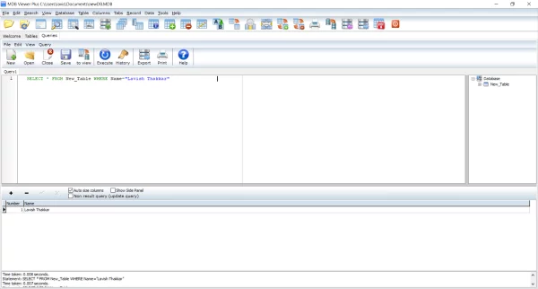 Ahora que viene a consultar sus datos, MDB Viewer Plus le permite ejecutar todo tipo de consultas desde el editor de consultas incorporado. Puede cargar el código SQL existente o escribir algo sobre la marcha. A continuación, puede ejecutar el código e incluso guardarlo en un archivo separado. Además, puede exportar o imprimir los datos consultados como un archivo de texto. Además, hay una opción para ver el historial de los comandos SQL ejecutados usando el editor de consultas.