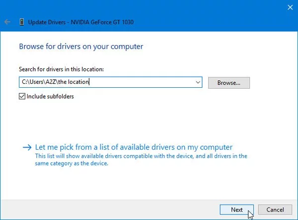 Si no tiene el archivo de instalación del controlador, en el campo de ubicación, utilice la siguiente ruta: