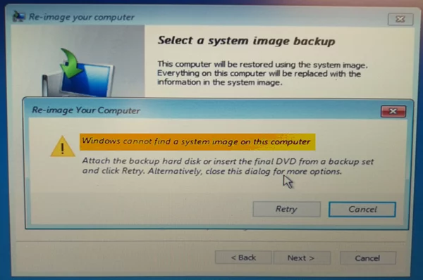 Windows no puede encontrar una imagen del sistema en este equipo, adjunte el disco duro de copia de seguridad o inserte el DVD final de un conjunto de copias de seguridad y haga clic en Reintentar. Alternativamente, cierre este cuadro de diálogo para más opciones.